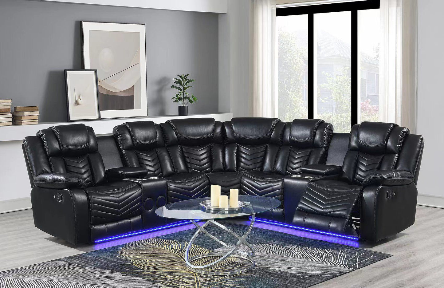 Experience the perfect blend of comfort, luxury, and technology with this Power Recliner Sofa. Upholstered in luxurious air leather, this sectional offers ultimate relaxation with its power recline feature, allowing you to effortlessly adjust to your preferred position. Equipped with a built-in Bluetooth speaker system, you can enjoy your favorite music or movies in stunning sound quality, while the LED lighting adds a modern touch to your space. The convenient cupholder console ensures you can keep drinks close by as you unwind.